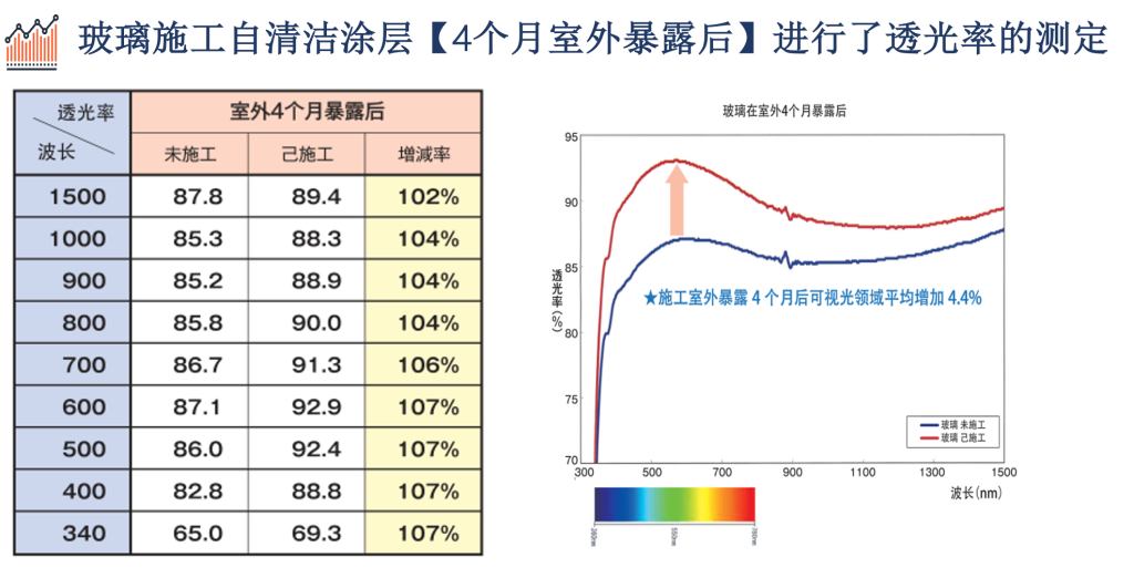 施涂自清潔涂層后,涂層增透光功效和自清潔功效可使設備增加約3%以上的發(fā)電量,提高業(yè)主方效益。