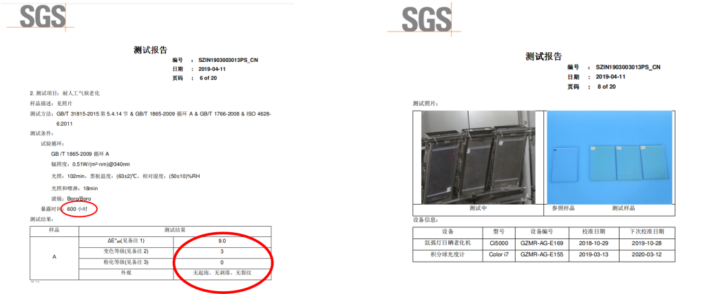 涂層耐老化性能優(yōu)越,為100%無機涂層,高耐候長年不劣化。涂層經(jīng)過600小時加速老化實驗,無粉化現(xiàn)象。實際應用中,受戶外自然風沙損耗,涂層高效期為五年,隨后效果逐年緩慢減弱。