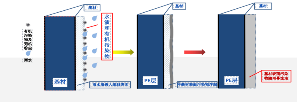 具備親水性能,水接觸角低于20°,有助于雨水沖刷污垢